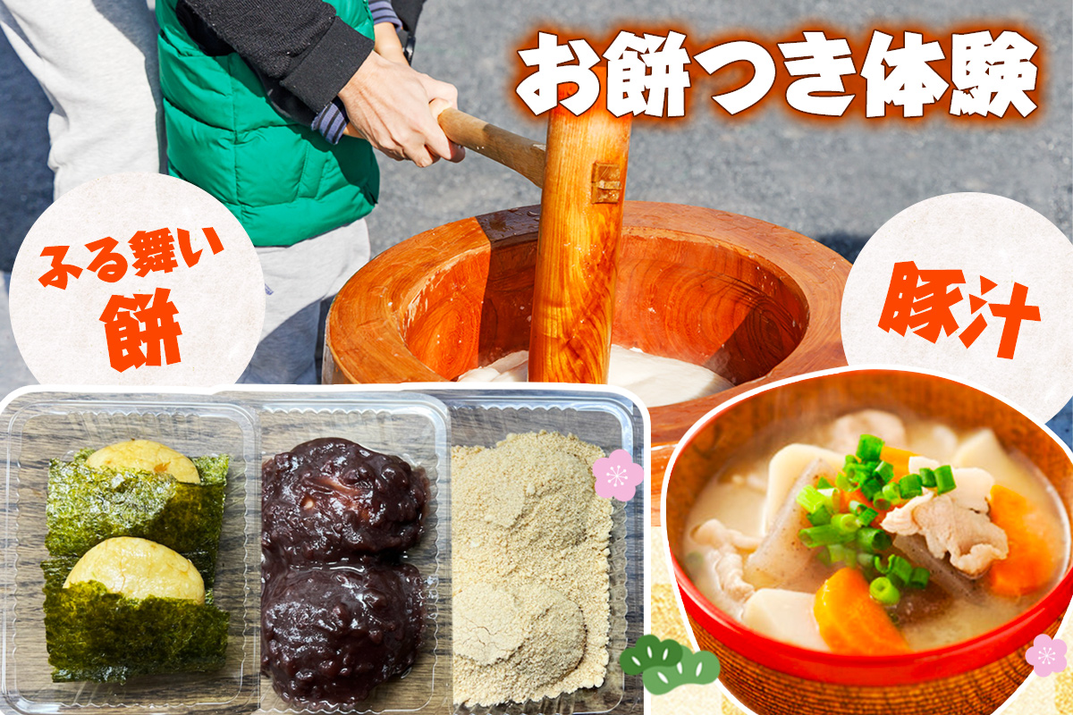 お餅つきでは、お餅つき体験とふる舞餅をもらうことができます。豚汁もご用意いたします。