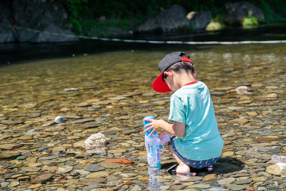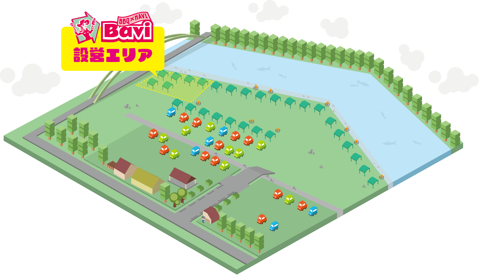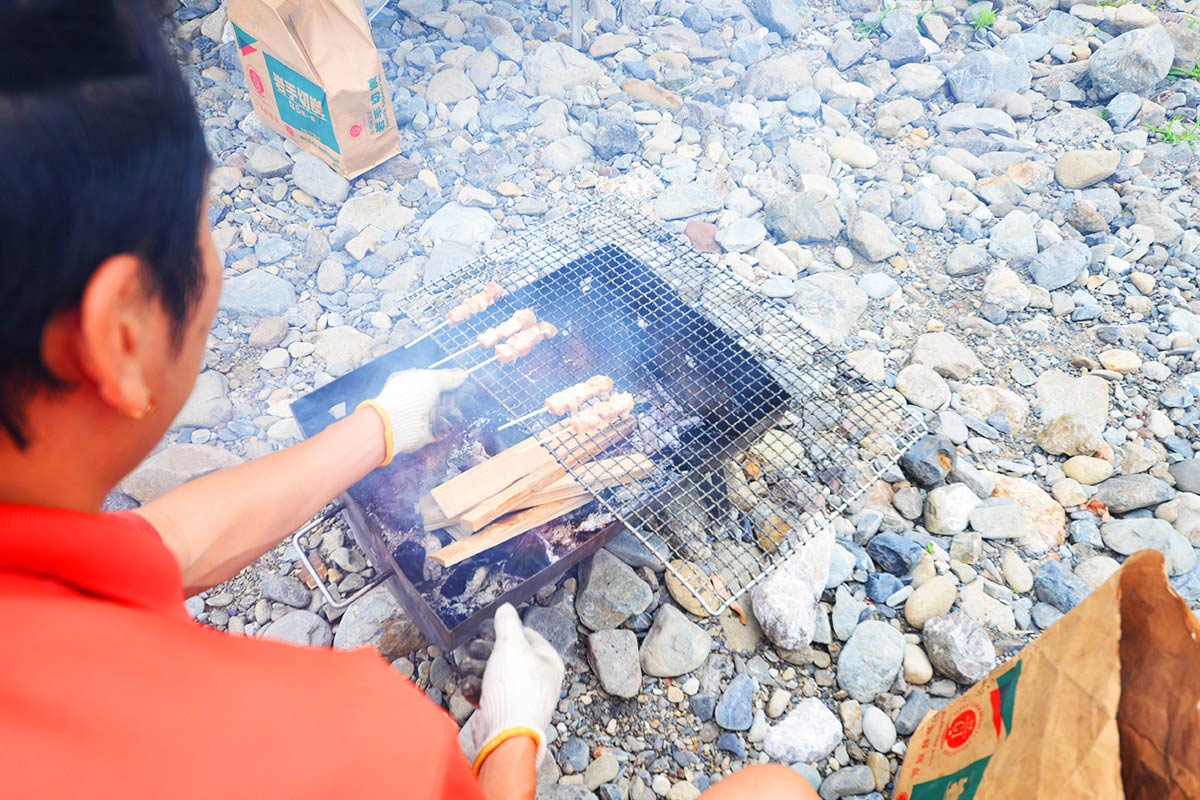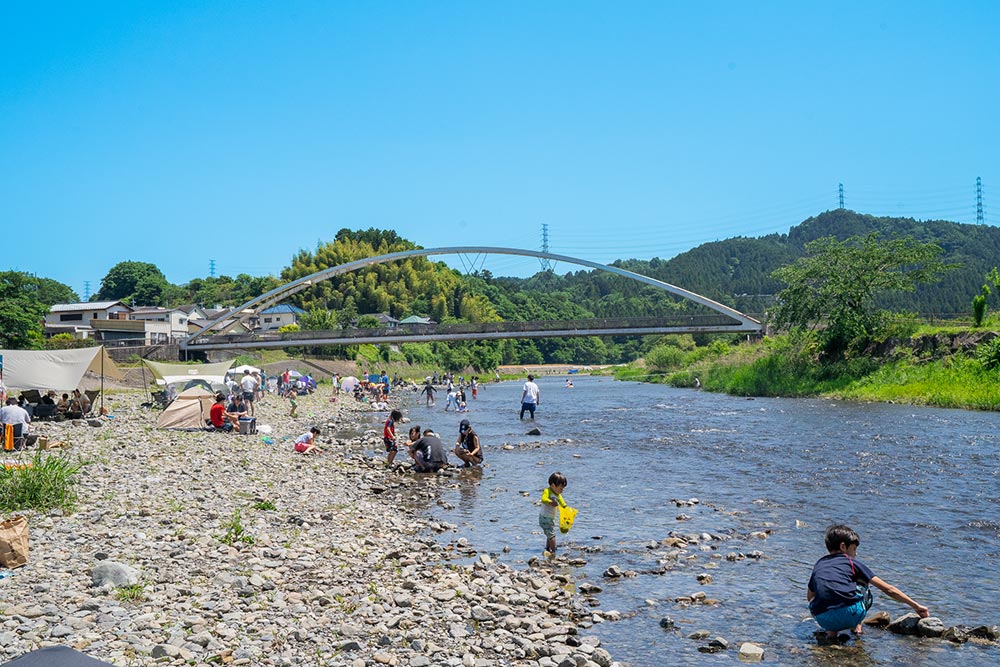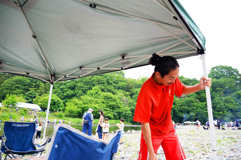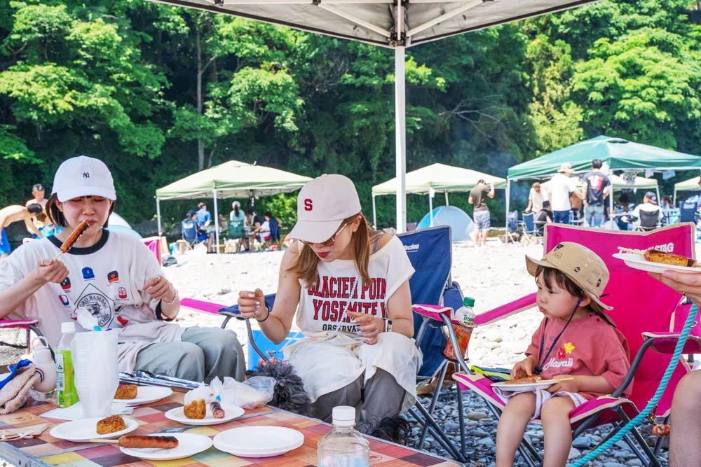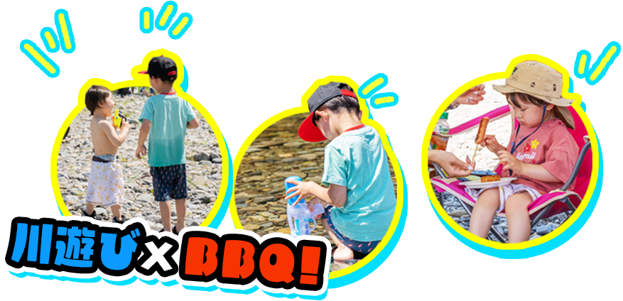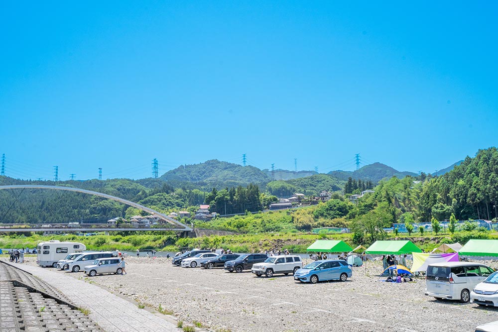 奥には駐車場があり、荷物の搬入もスムーズ。設営エリアから移動することなく、すぐにBBQをお楽しみいただけます。 また、お子様は目の前の川で水遊びもできるため、ご家族みんなで一日中楽しめるスポットです。